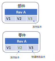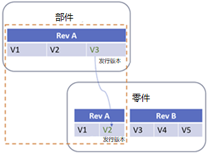 我们来看一个简单的示例:部件处于修订 A 阶段,零件处于修订 B 阶段。