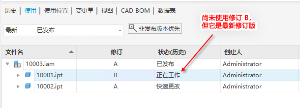 中选择了“最新”,则“使用”选项卡将显示最新文件的版本。它显示所有零部件/子零部件的当前阶段。