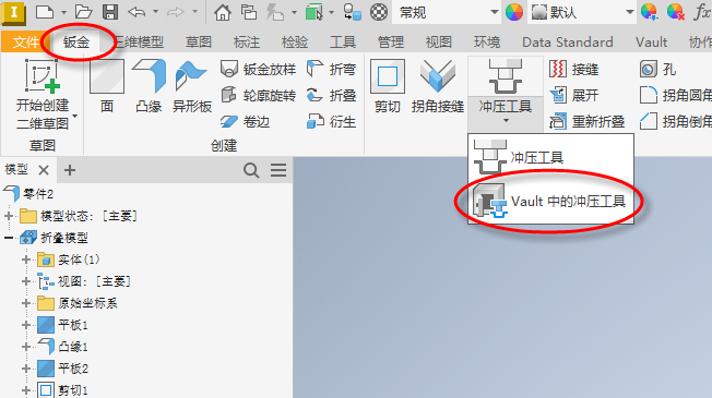 在功能区上,单击“钣金”选项卡 >“冲压工具”,然后选择“Vault 中的冲压工具”。