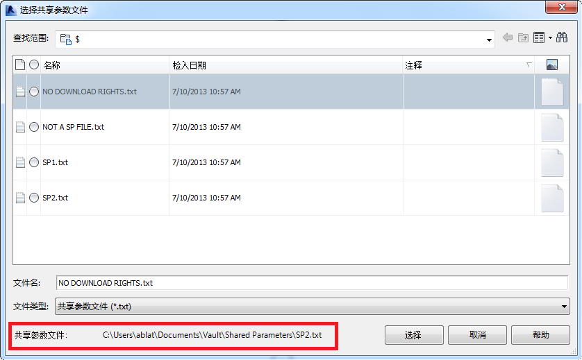 当前活动的“共享参数”文件会显示在“选择共享参数文件”对话框的左下角。