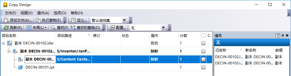 例如,如果某文件标记为用于复制,而关联的工程图标记为“自动”,则在复制操作完成后,该工程图将获得与关联文件相同的新文件名(带有后缀 (1)、(2)、(3) 等)和保存位置。