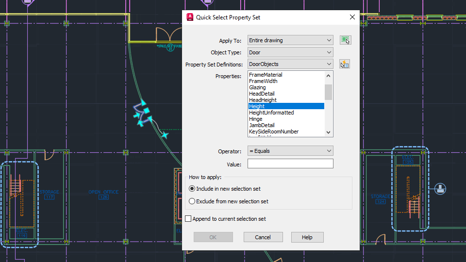 QSELECTPROPERTYSET creates a selection set by filtering object type and property set. For example, you can select all similar objects in a drawing that share the same property set values.
