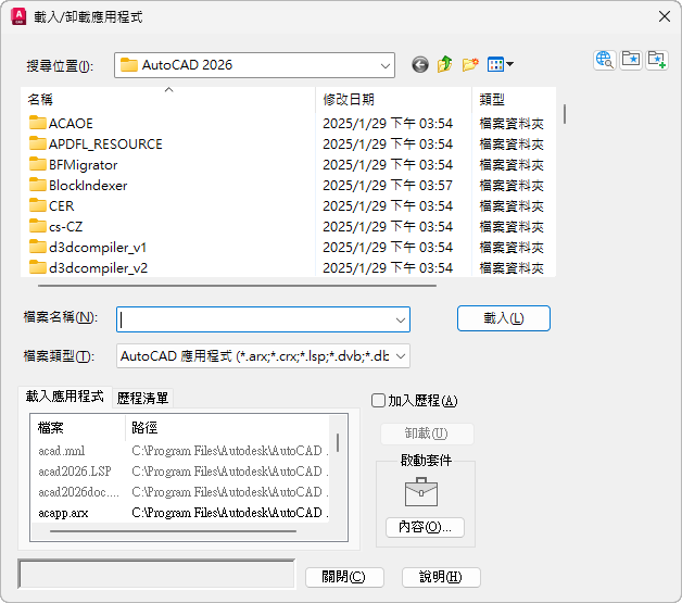 載入或重新載入目前在檔案清單或「歷程清單」頁籤內所選定的應用程式。在您尚未選取可載入的檔案之前,無法使用「載入」。會立即載入 ObjectARX、VBA 和 DBX 等應用程式,但 LSP、VLX 和 FAS 等應用程式則會列入佇列,等到您關閉「載入/卸載應用程式」對話方塊時才載入。