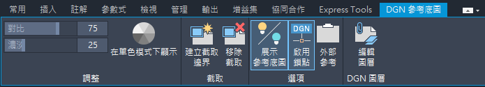 選取圖面中的 DGN 參考底圖時,功能區上會顯示「DGN 參考底圖」關聯式頁籤。