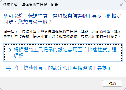 如果已勾選「自訂與屬性」品類,動態的性質和屬性圖塊會顯示在「快速性質」選項板。