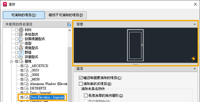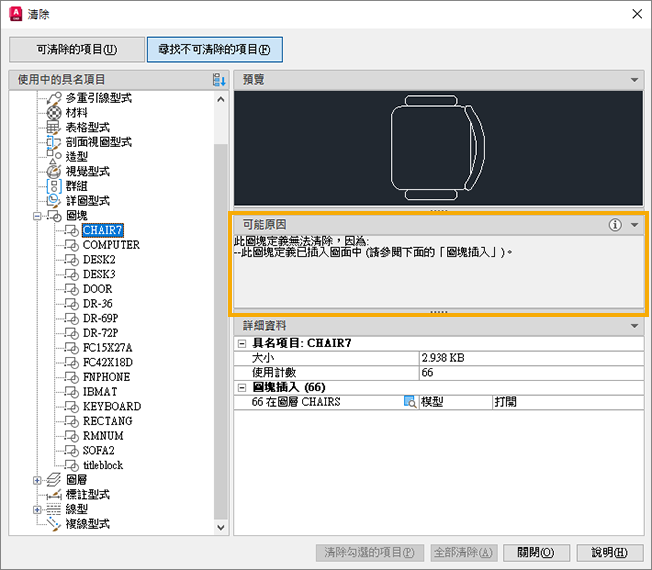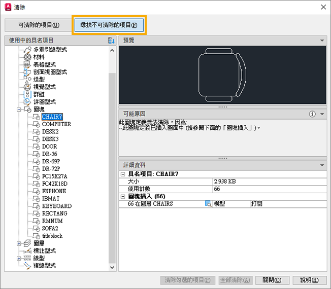 可能有您想要清除的項目,但並未顯示在「未使用的具名項目」清單中。使用「尋找不可清除的項目」清單可檢視圖面中正在使用的具名項目。