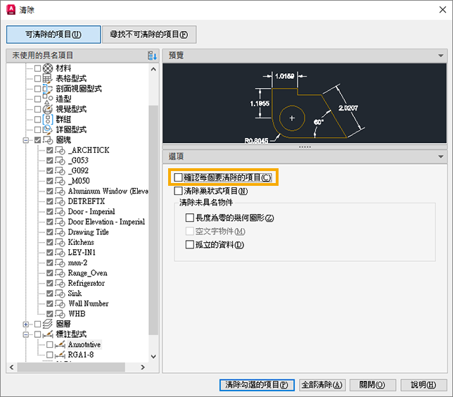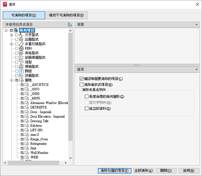清除是從圖面中移除未使用的項目或具名物件,例如圖塊定義和圖層。