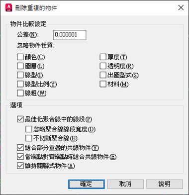 OVERKILL 預設不會對有區分性質的物件起作用。例如,如果物件相同但位於不同圖層或線粗不同,則這些物件就不會被視為重複。但是,您可以變更設定以忽略某些性質。