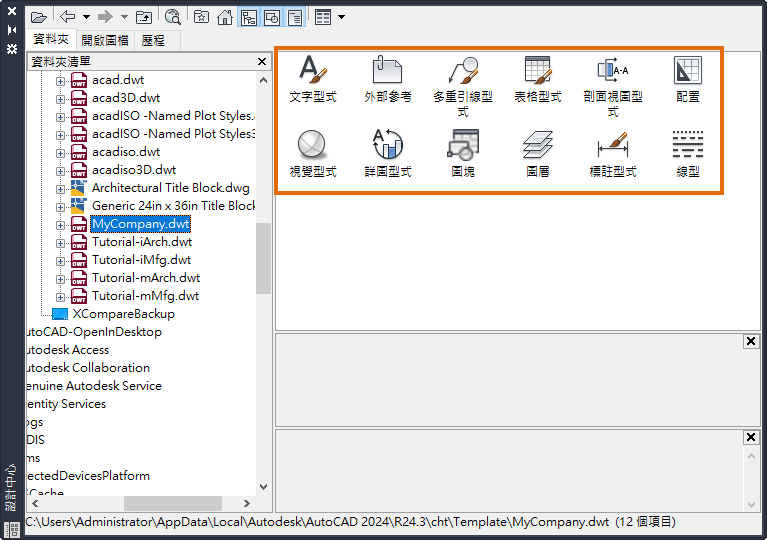假設您想要從更新的公司樣板匯入一些標註、文字和表格型式。這些型式是在您開始圖面後才加入樣板中,因此不會從樣板帶入。在此範例中,我們將使用「設計中心」匯入某些型式。