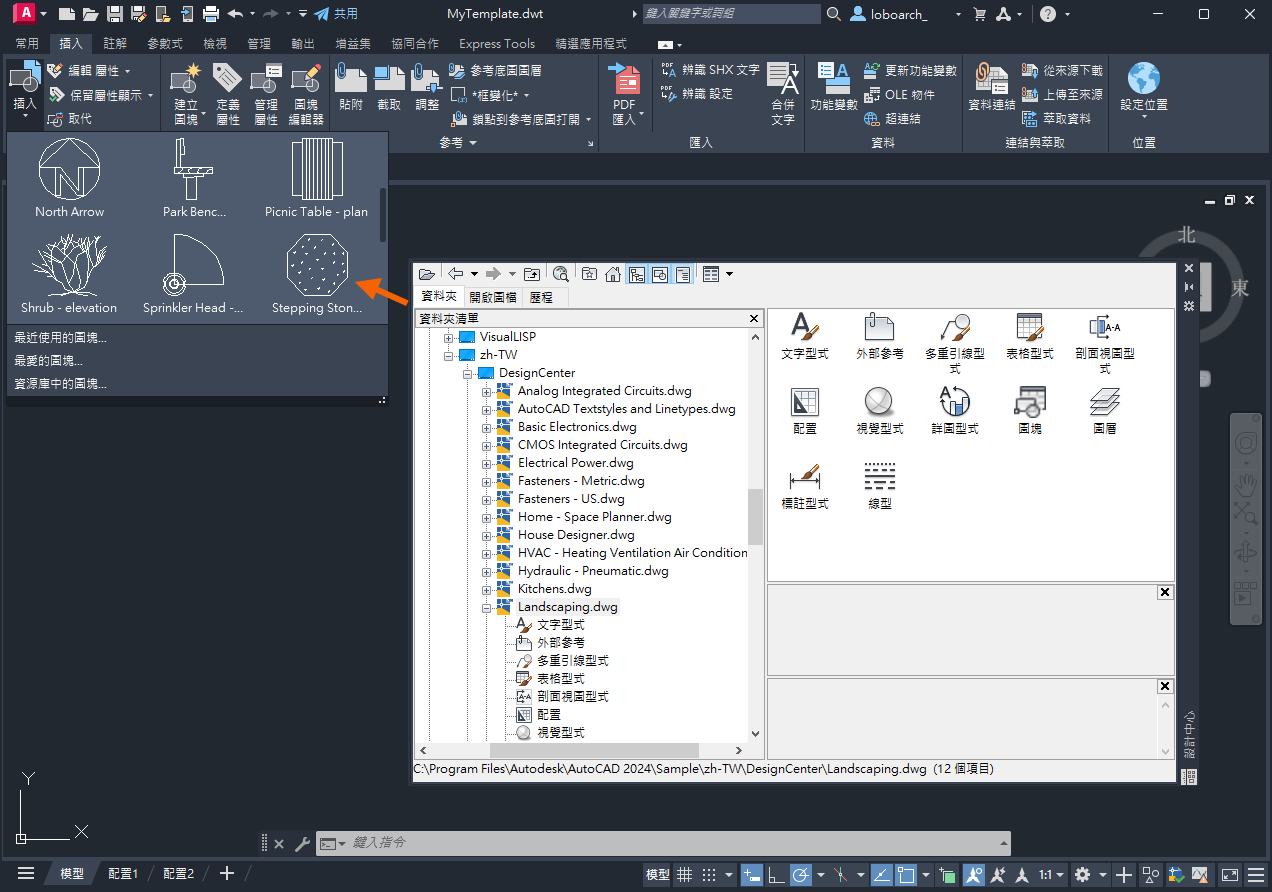 現在,在 Landscaping.dwg 中定義的具名型式、圖塊和圖面設定,都可在 MyTemplate 中使用。