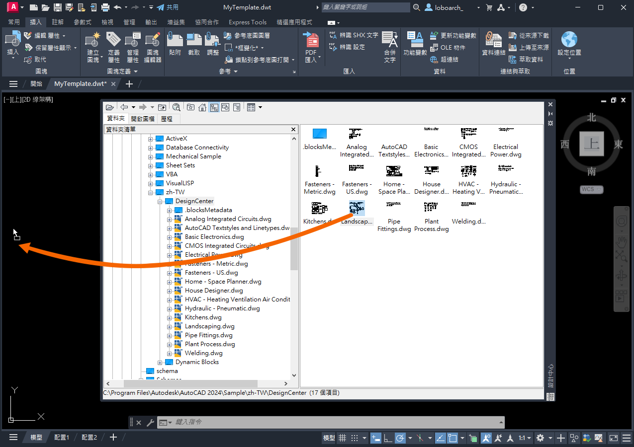 將 Landscaping.dwg 中的圖層、圖塊和型式加入樣板。