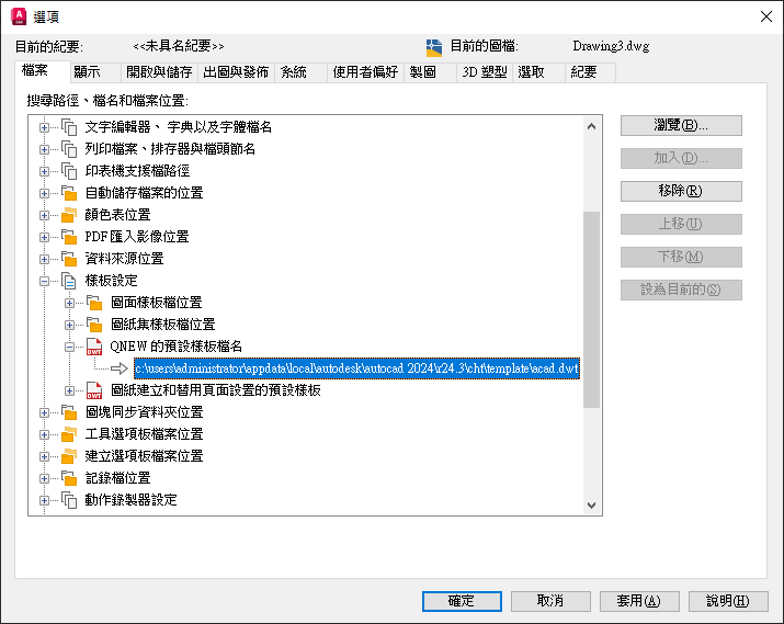 既然您建立並儲存了樣板,我們就來使用。當您啟動新圖面時,AutoCAD 預設會從「QNEW 的預設樣板檔名」中指定的樣板建立圖面,在此範例中為 acad.dwt。我們來變更此設定,以使用新樣板開始新圖面。