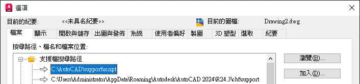 註: 您可以在「選項」對話方塊 (OPTIONS 指令) 的「檔案」頁籤上,管理 AutoCAD 支援檔搜尋路徑設定的資料夾。如需將資料夾加入 AutoCAD 支援檔搜尋路徑設定的資訊,請參閱修改支援檔搜尋路徑