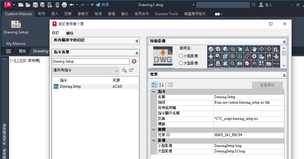使用 SCRIPT 指令可以定義巨集,以從功能區按鈕執行特定腳本。以下是啟動 SCRIPT 指令並執行名為 drawing_setup.scr 之腳本檔的巨集內容: