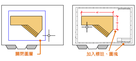 以完整大小建立模型完成後,您可以切換至圖紙空間配置,在其中建立模型的比例視圖,也可以加入註記、標示和標註。您也可以指定在圖紙空間中顯示不同的線型與線寬。