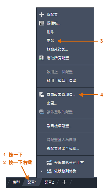 當您要存取配置頁籤時應做的第一件事,是 (1) 在配置頁籤上按一下右鍵,並 (2) 將其更名成 (3) 比「配置 1」更具體的名稱。參考特定 ANSI 或 ISO 大小的名稱可能是不錯的選擇。
