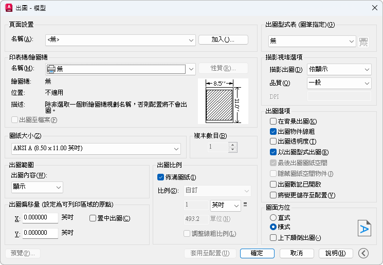 若要建立新頁面設置,請按一下「新建」並輸入新頁面設置的名稱,然後按一下「確定」。然後會顯示類似「出圖」對話方塊的「頁面設置」對話方塊。選擇所有要儲存的選項和設定。