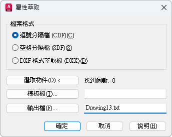 產生「AutoCAD 圖面交換檔」格式的子集,其中只含有圖塊參考、屬性,以及序列結束物件。DXF 格式萃取不需要樣板。副檔名。dxx 可從一般的 DXF 檔中區分出輸出檔。