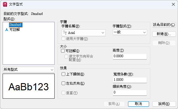 指定字體字元的格式,如斜體、粗體或標準。如果選取「使用大字體」,此選項變成「大字體」名稱,且可用來選取「大字體」檔名。