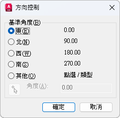 設定零角度的方向。下列選項會影響角度、顯示格式、極座標、柱座標與球形座標等項目。