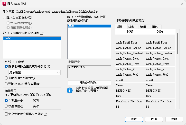 標準為預設對映設置,其從正匯出的圖面中萃取資料並將自動對映套用至 DGN 圖層、線型、線粗和顏色,如對映預覽所示。