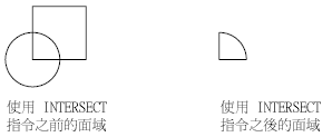 使用 INTERSECT,您可以從兩個或多個既有面域的重疊面積建立 2D 面域物件。您可以僅選取面域來與 INTERSECT 配合使用。