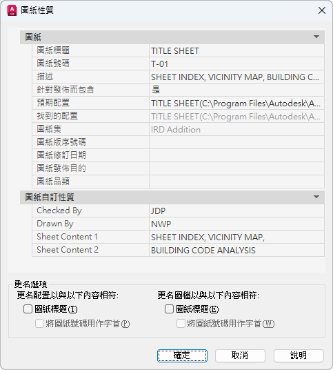 顯示所選圖紙所特有的資訊,例如,圖紙標題、圖紙號碼,以及是否包括在發佈作業中。還顯示自訂性質 (如果有)。