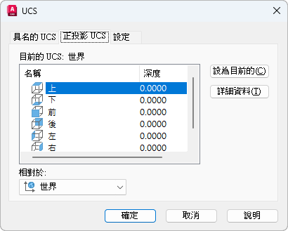 列示目前圖面中定義的六個正投影座標系統。正投影座標系統是根據「相對於」清單中所指定的 UCS 定義的。