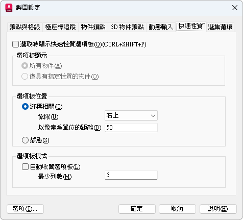 設定快速性質選項板的顯示設定。請參閱「自訂快速性質」的更多資訊。
