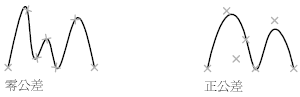 指定允許雲形線偏離指定擬合點的距離。0 公差值的前提為產生的雲形線必須直接通過擬合點。公差值適用於所有擬合點,但起始和結束擬合點除外,因為這兩種擬合點的公差一律為 0。