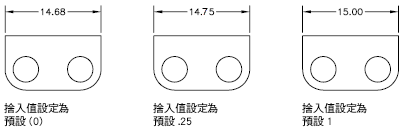 您可以捨入所有標註值,角度標註的標註值除外。例如,如果您指定捨入值為 0.25,所有的距離會被捨入到最接近 0.25 個單位。小數點後的小數位數顯示,取決於主要單位與對照單位以及側向公差值的精確度設定。