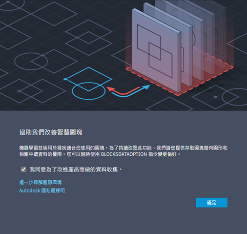 當您第一次使用圖塊取代或圖塊轉換功能時,會顯示一個同意對話方塊,要求您存取圖塊資料。分享內容資料可協助 AutoCAD 改善圖塊建議和此功能的其他功能。但是,即使您選擇不分享資料以供改進產品,仍然可以使用「智慧圖塊」。