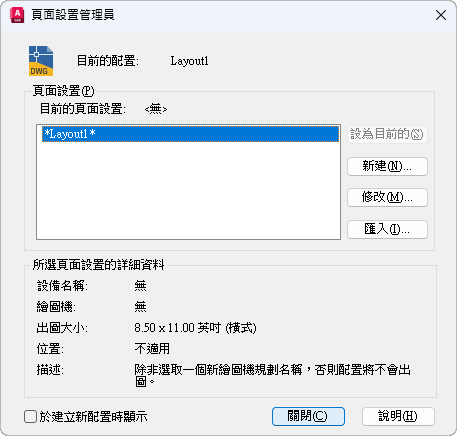 從「圖紙集管理員」開啟「頁面設置管理員」時會顯示。
