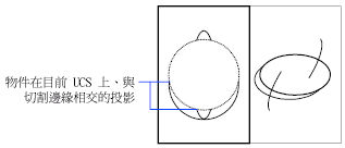 指定投影到目前 UCS 的 XY 平面。此指令會修剪在 3D 空間內不與切割邊相交的物件。