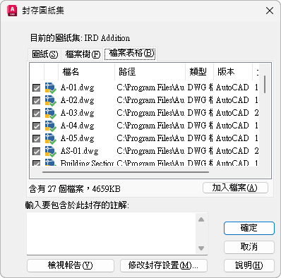 使用表格格式顯示要併入封存套件中的檔案。依預設,目前圖面的所有相關檔案 (如相關的外部參考、出圖型式和字體) 都會列出。您可以將檔案加入封存套件,也可以移除既有的檔案。URL 所參考的相關檔案不會併入封存套件。