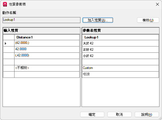 以下是一個包含三個值的「參數表」參數範例,其中兩個值使用範圍,為圖塊的「參數表」性質指定值。
