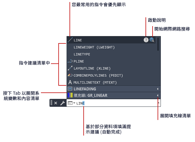 當您在指令視窗中或是動態輸入方塊中輸入指令的前幾個字母時,建議的指令清單會隨即顯示。依預設,清單具有以下特性: