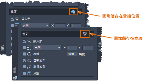 註: 「圖塊」選項板底部的「圖塊同步設定」按鈕是動態的,會根據您最近使用和我的最愛圖塊的目前位置變動。