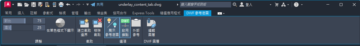 選取圖面中的 DWF 參考底圖時,功能區上會顯示「DWF 參考底圖」關聯式頁籤。