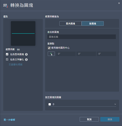 您也可以將來源物件或選取的實例轉換為新圖塊。在「轉換」對話方塊中,透過指定圖塊名稱和插入點定義新圖塊。插入點預設會設定為選取的幾何圖形中心。