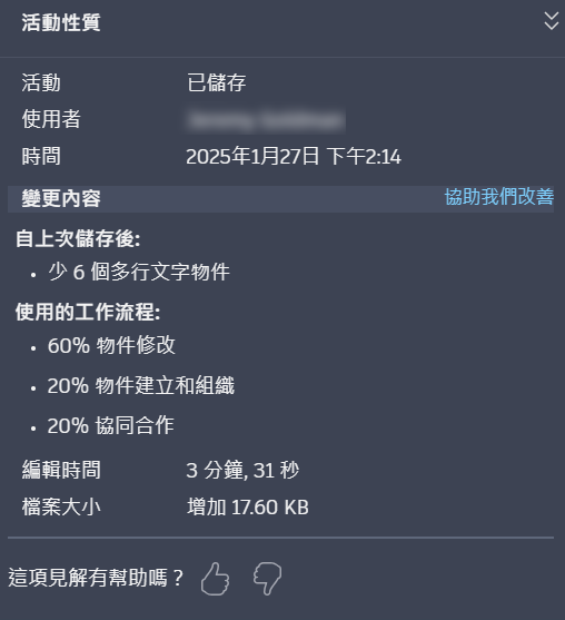 新的「變更內容」見解概述在各個「已儲存」活動之間所做的編輯,讓您有效率地繼續工作。