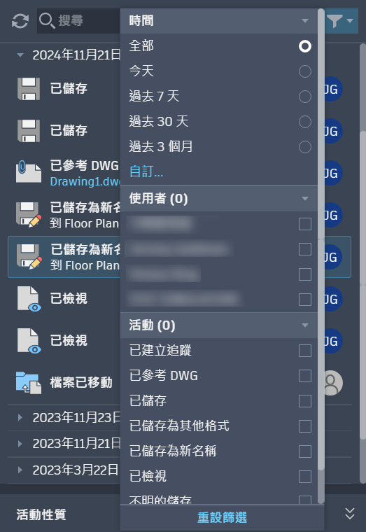 為了方便使用,我們簡化了搜尋列和篩選列。現在,您可以使用一個按鈕,依時間、使用者和特定活動篩選活動。