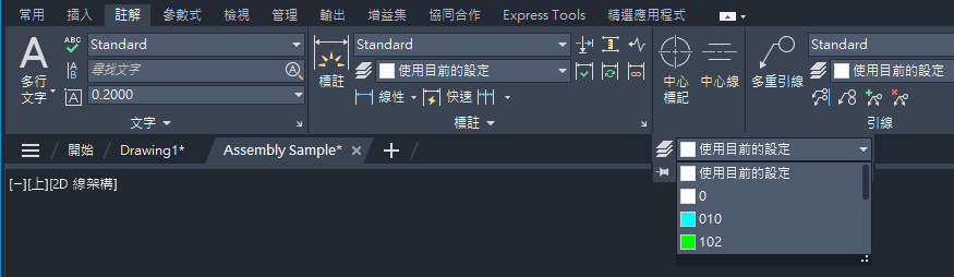 在功能區的「註解」頁籤 >「中心線」面板上,使用「圖層」控制項。
