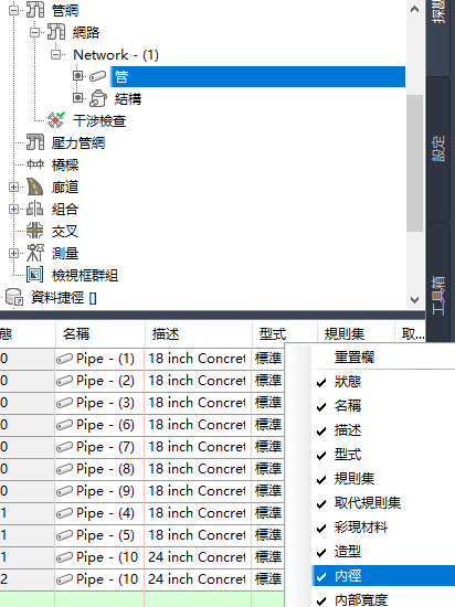 您可以在「探勘器」頁籤中快速編輯該管網的多個管或結構的型式,如圖 3 所示。