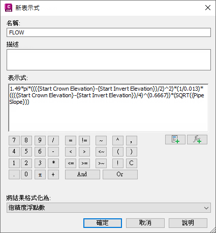 此表示式假定曼寧方程式中的「n」值為 0.013 (這是混凝土管的標準)。實際上,對於曼寧方程式中的「n」值,管已有具名元件,您可以設定該元件。然而,將該元件加入至表示式會導致非預期的結果,因此您不應將其用於此程序。