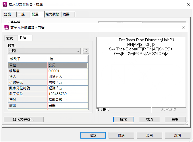 下一步是為計畫和縱斷面建立顯示此流量值的管標示型式。圖 12 展示的範例中,此標示型式具有所有相關的水力設定: