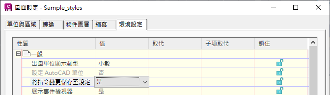 - 按一下「環境設定」頁籤,並展開「一般」性質。將「將指令變更儲存至設定」性質設為「是」,如圖 11 所示。