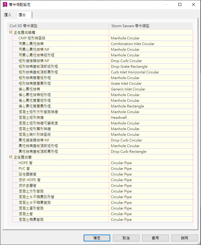 在 Storm Sewers 和 Autodesk Civil 3D 之間來回匯出匯入資料時,有幾項「零件相符預設」的限制。