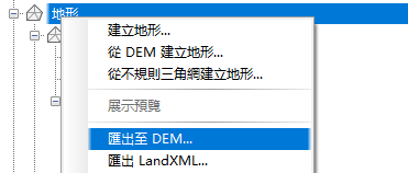 Autodesk Civil 3D 可以讓您從地形匯出 DEM 檔案。匯出時,您可以展開格線間距以使檔案更小。圖 3 展示了所選取的用於啟動匯出程序的功能表。