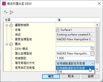 用於確定每個點處之高程的方法是重要的匯出設定。您可以選擇在格線點處取樣地形高程,也可以選擇從周圍點計算平均高程。後一種方法 (使用平均) 更為耗時。為了使效率更高,請使用地形取樣選項,如圖 4 所示。